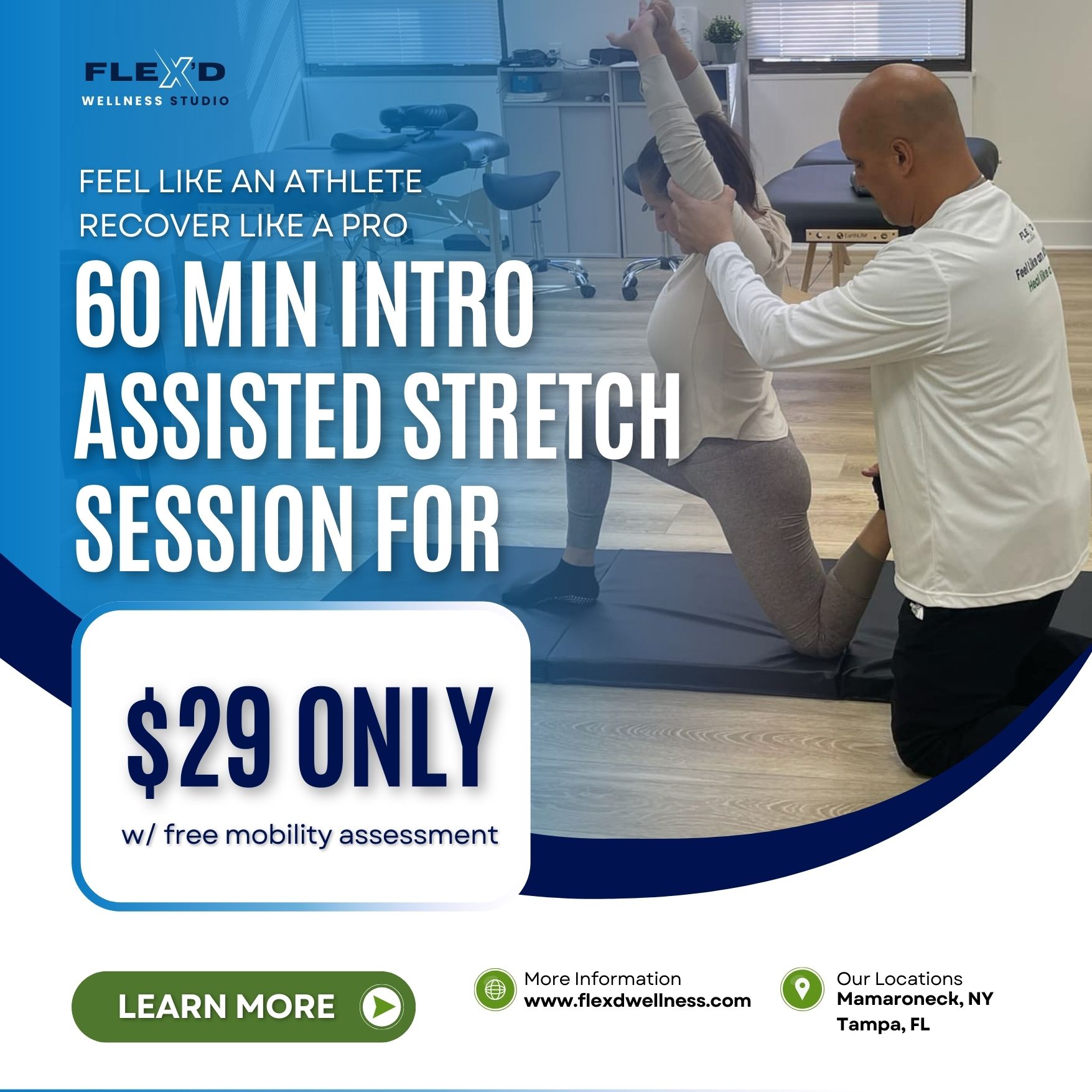 For a limited time, enjoy our 60-minute introductory Assisted Stretch Session for just $29, including a FREE Mobility Assessment to identify where your body needs the most support.